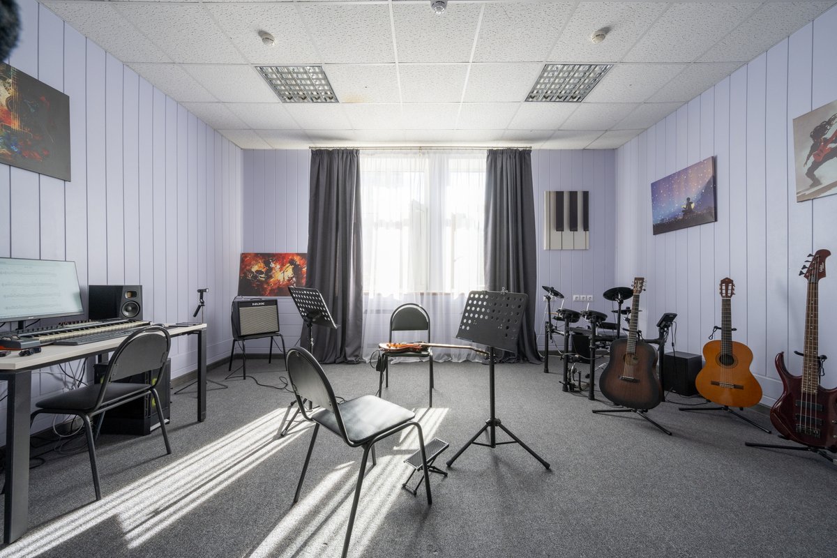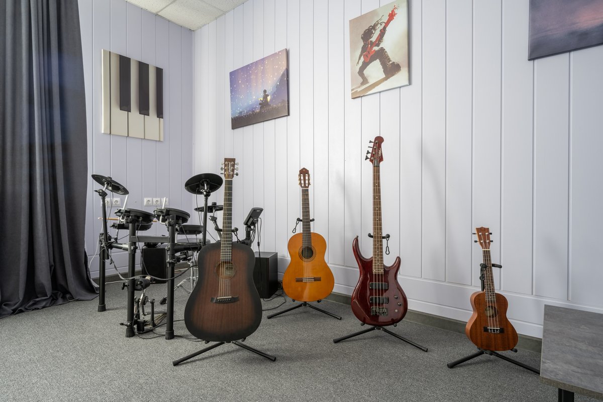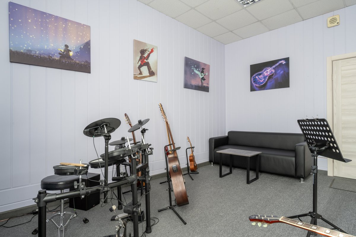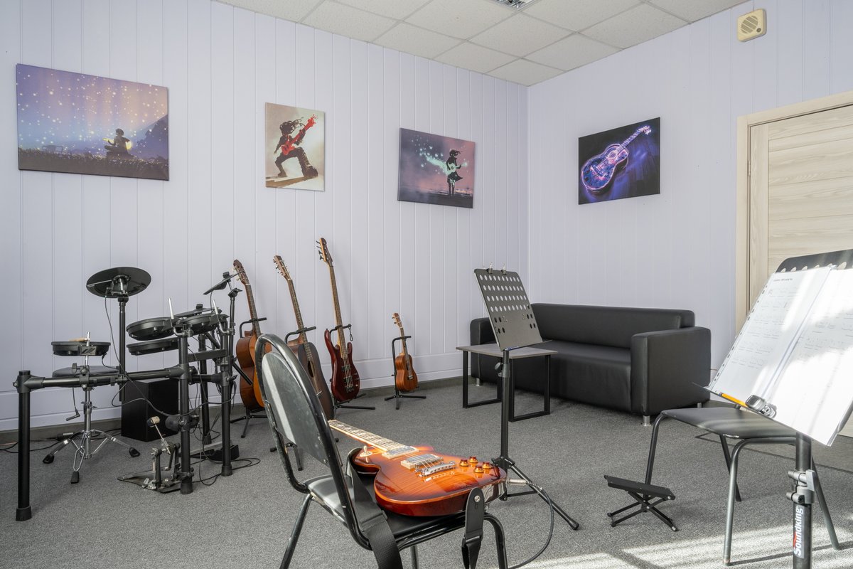 Наши занятия проходят в полностью оборудованной студии, где есть всё необходимое для обучения: гитары, барабаны, компьютер, аудио- и видеотехника для записи инструментов и просмотра видеоматериалов, а также комфортное пространство для индивидуальных и групповых занятий.