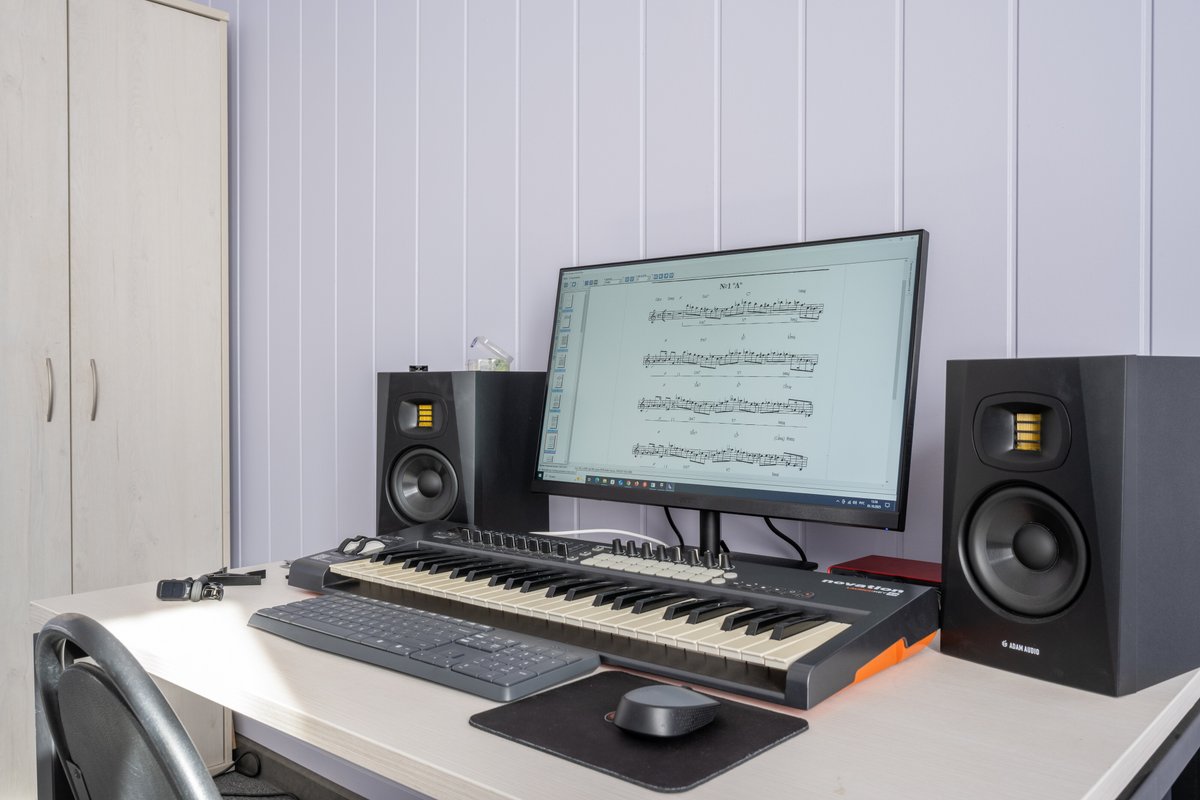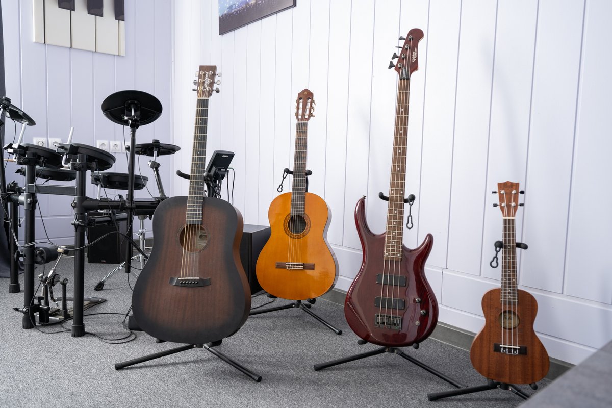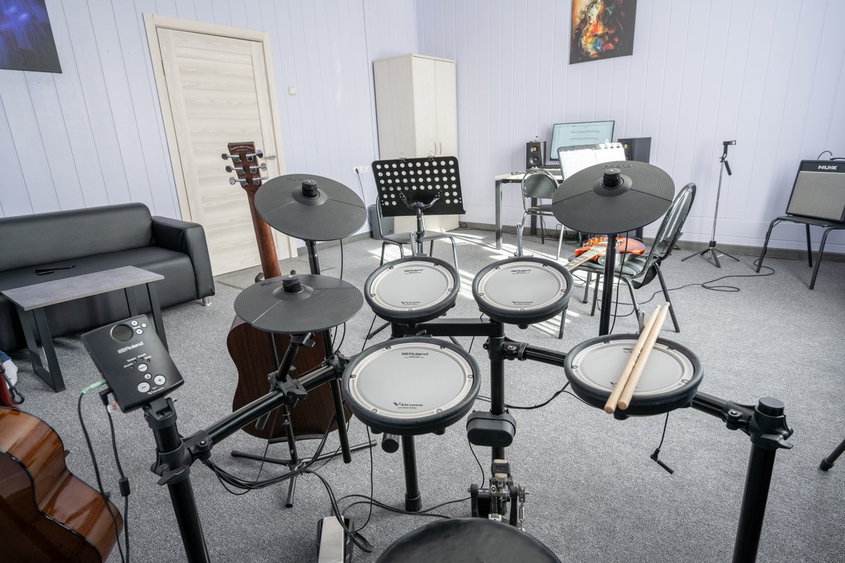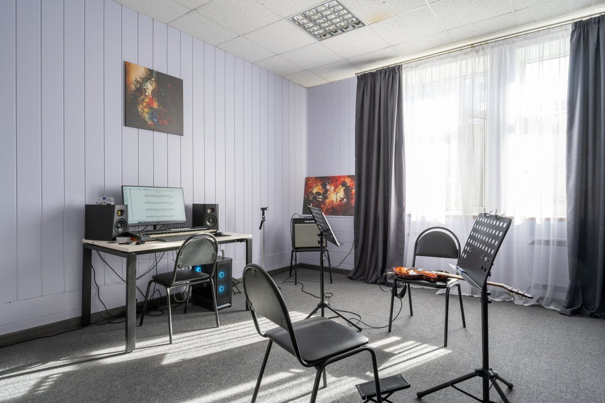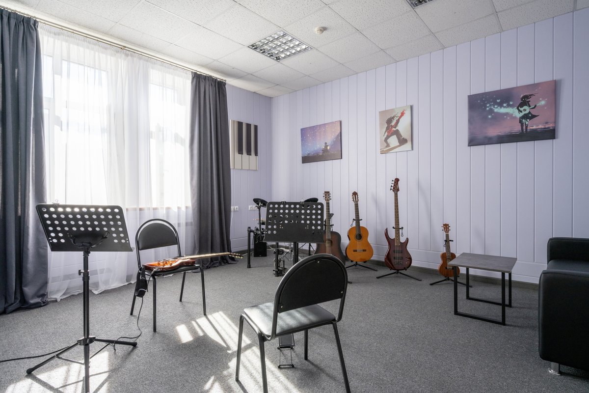 Наши занятия проходят в полностью оборудованной студии, где есть всё необходимое для обучения: гитары, барабаны, компьютер, аудио- и видеотехника для записи инструментов и просмотра видеоматериалов, а также комфортное пространство для индивидуальных и групповых занятий.